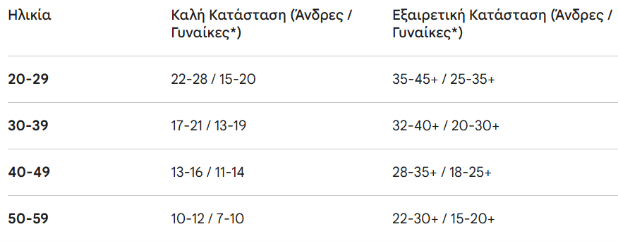 Δεν υπάρχει ένας μαγικός αριθμός για όλους, καθώς η απόδοση επηρεάζεται από την ηλικία, το βάρος και την εμπειρία. Ωστόσο, το American Council on Exercise παραθέτει ορισμένα ορόσημα για να αξιολογήσετε το επίπεδό σας: